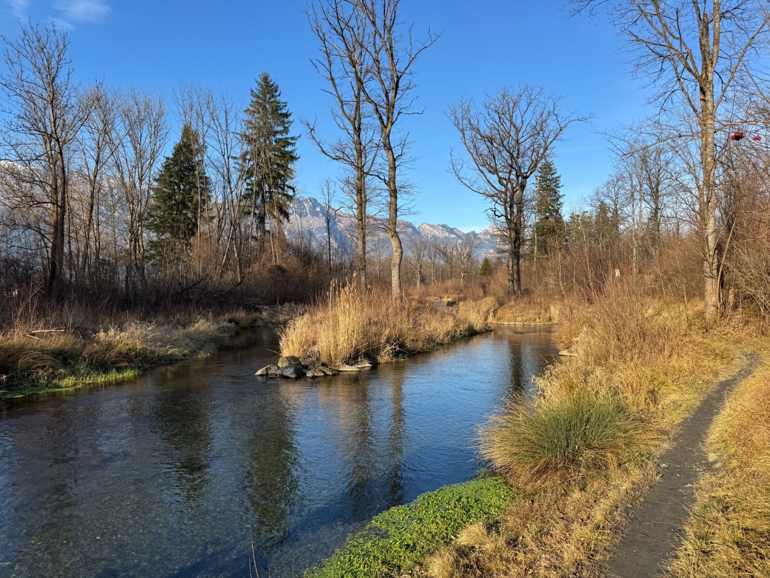 Auf unserer Nachmittagstour durch die Rheinebene wandern wir entlang revitalisierter Bäche und durchstreifen den reaktivierten Auenwald. Wir erkunden auch Gebiete, die noch nicht erneuert wurden, und erleben so die Monotonie dieser Flussläufe. Der letzte Abschnitt führt uns durch das Gamser Riet, bevor wir unser Ziel im Dorf Haag erreichen.