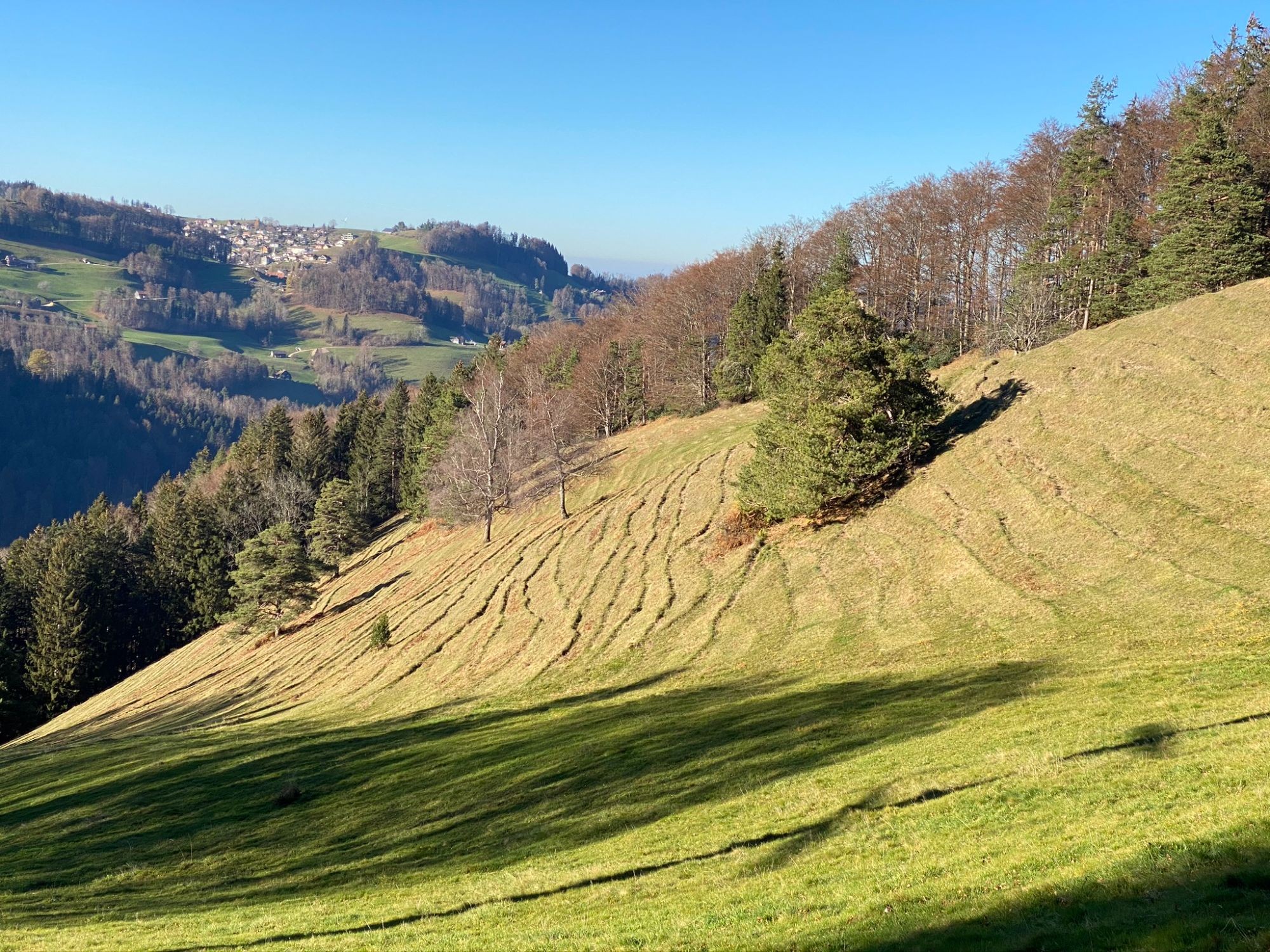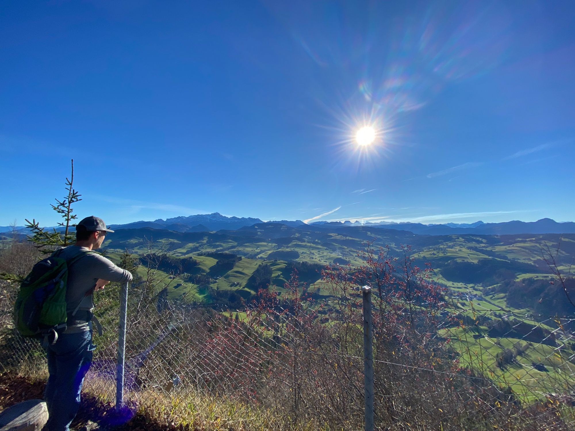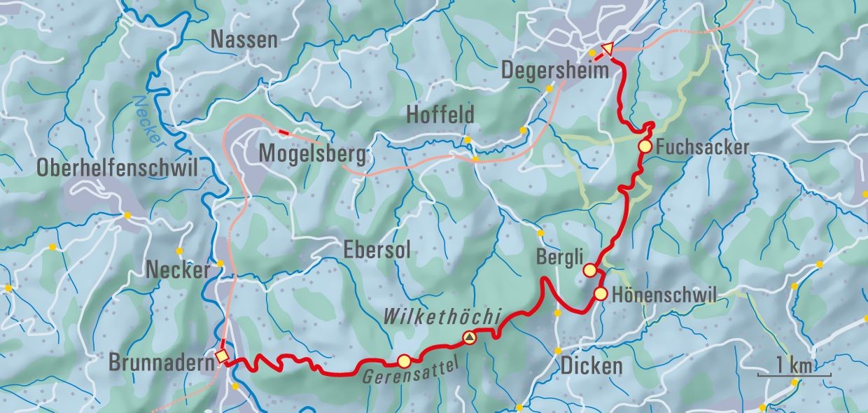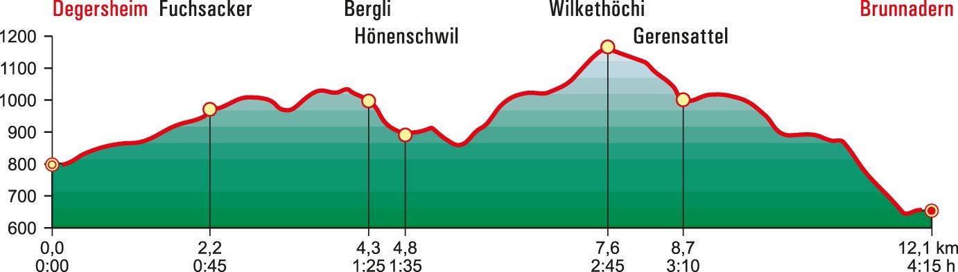 Nach einem kurzen Aufstieg wird Degersheim und damit auch die Asphaltstrasse verlassen. Auf einem schattigen Waldsträsschen geht es dem Fuchsacker zu, wo man in die Sonne tritt und sich das Panorama des Alpsteins öffnet. In stetem Auf und Ab wandernd leiten Wald- und Wiesenwege zum Bergli. Hier schweift der Blick vom grünen Graben des Neckertals über die Churfirsten zu den Bergen des Glarnerlandes. Ein steiler, aber kurzer Abstieg – begleitet von exotischem Papageiengeschrei aus einem Tierheim – führt zu den hübschen Häusern von Hönenschwil. Auf einem Wiesenweg wird Dicken umgangen, dann beginnt der anstrengende Aufstieg zur Wilket. Bald ist der Höhenzug erreicht. Schöne Weglein folgen diesem zum höchsten Punkt, der Wilkethöchi. Diverse Bänkli, Hocker und Liegestühle aus Holz laden zum Pausieren und Sonnetanken ein. Eine Panoramatafel benennt die Gipfelparade, die im Osten mit dem Hohen Kasten beginnt und via Alpstein, Churfirsten, Glarner und Urner Alpen sowie die 4000er der Berner Alpen bis zum Brienzer Rothorn reicht. Der Abstieg führt immer auf der Krete hinab zum Gerensattel, dann abwechslungsreich durch Wälder und über sonnenbeschienene Weiden Brunnadern zu. Auf diesem Wegabschnitt öffnet sich die Aussicht über die Weite des Mittellandes, das oft unter einem Nebelmeer liegt. Ein letzter knackiger Abstieg durch einen dick mit Laub überdeckten Weg führt hinab nach Brunnadern.